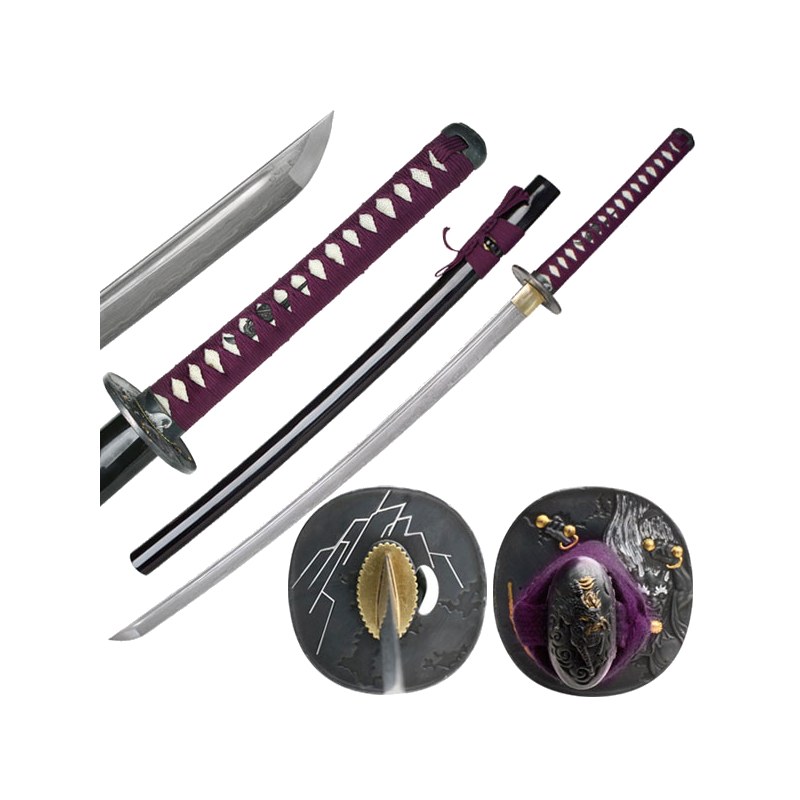 This Ten Ryu Samurai Sword is a hand-forged masterpiece measuring 40.5" in overall length. It features a 28" carbon steel blade with a 7mm thickness, meticulously crafted with 10 folded layers and a traditional blood groove. The handle offers an authentic and luxurious feel, featuring real ray skin wrapped in genuine purple Japanese silk. The sword is adorned with an oxidized zinc alloy tsuba displaying a Japanese symbol and comes complete with a black lacquer scabbard and a protective sword bag.