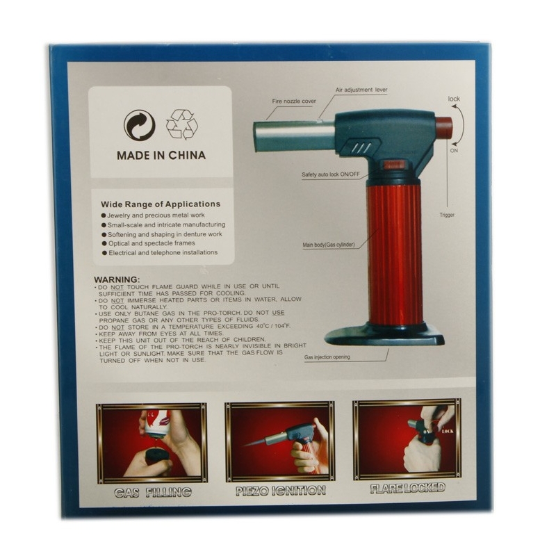 Specifications 1.electronic ignition 2.filled with vapor,safety switch 3adjustable flame size 4.rubber grip 5.with function of locking fire heating and welding torch Professional Statement 1. Commercial Features . Electronic ignition; can be repeatedly filled with vapor; use butane. 2. Characteristics . Provide much more energy, and the flame is long and intense. . The size and temperature of the flame is adjustable. The flinging flame also can be changed. The firm foundation can be separated when used, and can stand when collected. . Rubber grip, soft texture. Metal handle, luxurious elegance. . Have the function of fire lock.